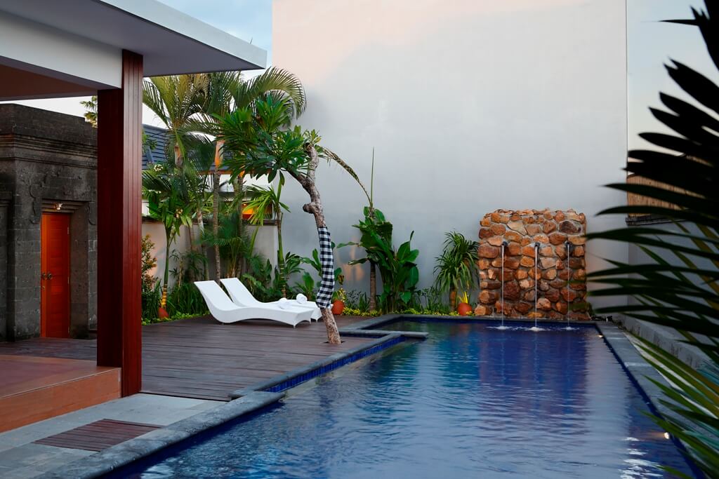 The overall concept of the villa is designed to maximizing privacy of the guest, the design blends Balinese traditional and modern elements combined with luxurious amenities that invites guest to experience the pleasures of tropical living. The Villa offers 8 private pool villas in Seminyak, consist of 8units One Bedrooms Villa, 2 unit Two Bedrooms Villas, and 1 unit of Three Bedroom Villas. Each Bali villa features a private entrance, private garden, private pool, and living also a dining area.